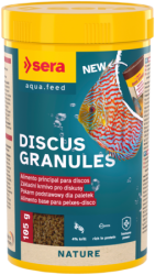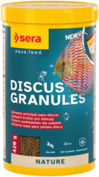 sera Discus Granules je základné krmivo bez farbív a konzervačných látok, ktoré sa skladá zo šetrne vyrobených mäkkých granúl pre všetky diskusy (vrátane plôdika) a ďalšie náročné okrasné ryby. Odolnosť voči chorobám, zdravý vývoj aj plodnosť posilňujú optimálne stráviteľné akvatické bielkoviny a zložky bohaté na minerálne látky. Cesnak a prebioticky účinné zložky ideálne dopĺňajú ľahko stráviteľné, chutné zloženie. Potápajúce granule rýchlo mäknú bez toho, aby za vlhka napučali alebo stratili svoj tvar. Voda tak nie je znečistená. Návod k použitiu: 1–2x denne toľko koľko ryby spotrebujú v krátkom čase.